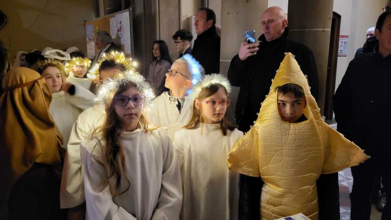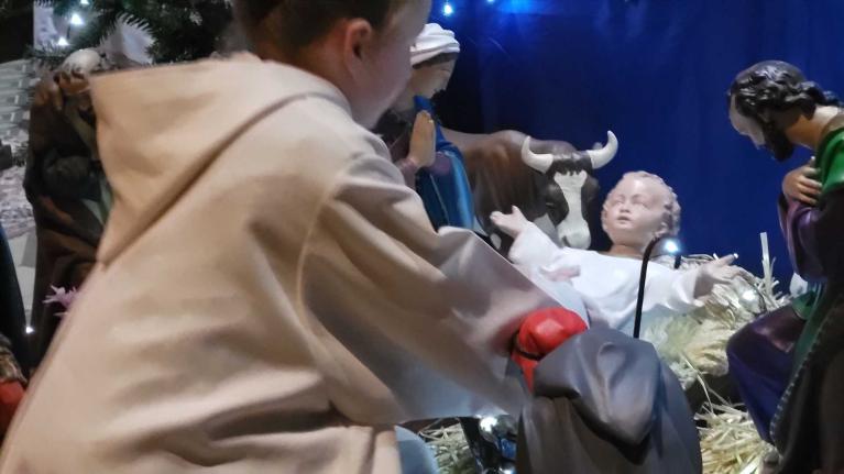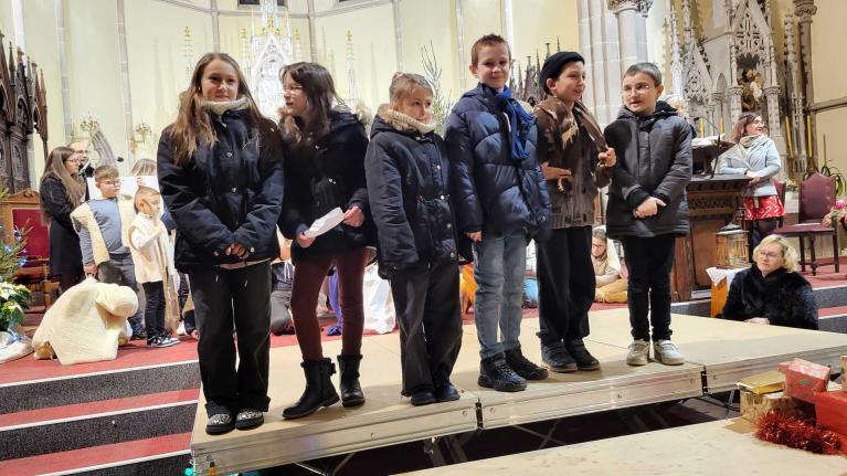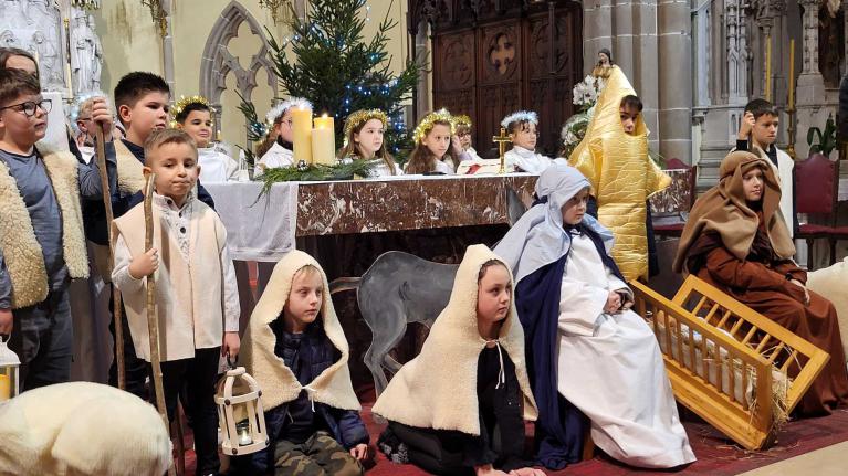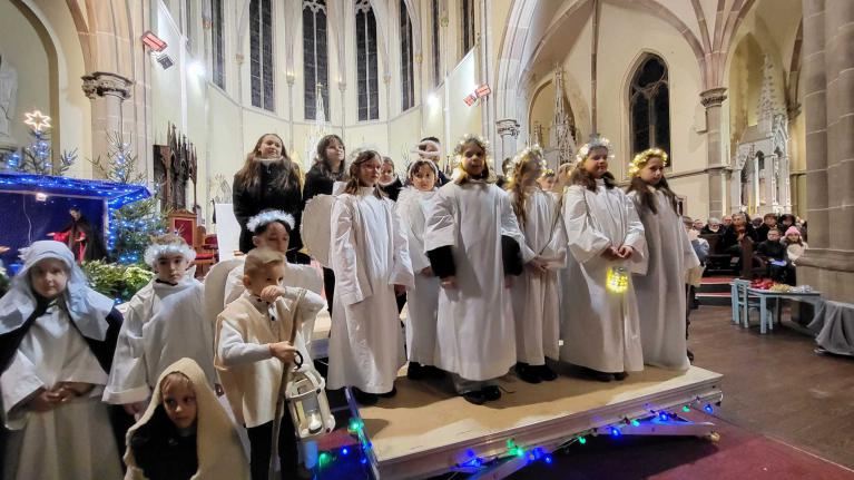 A SARRALBE à 17 H 00 en l'église St Martin, plus de 500 personnes ont pris place pour le soir de la Nativité. Tout a débuté par une veillée, une saynète jouée par des enfants et de la 1ère Communion. L'histoire racontait que le soir de Noël, une commerçante du nom de Lyne venait de fermer son magasin et s'apprêtait à rentrer et fêter Noël seule. En se rendant chez elle, elle rencontre sur sa route, un SDF mendiant, du nom de François qui est seul et triste. Elle s'arrête et lui glisse une piécette dans sa coupelle... Merci lui dit François et Joyeux Noël. Puis tous les deux partent regarder la crèche installée en ville. Pour François, cette crèche lui rappelle que lui aussi est important pour Dieu. Comme Lyne est seule, François lui propose de rejoindre une salle de la paroisse, où une équipe a préparé un repas pour les gens seuls et de la rue. Au cours du repas, chaque participant reçoit un cadeau, collecté durant le mois. Lyne en reçoit un aussi. Mais je n'ai pas de cadeau à donner, moi, dit Lyne. De son cadeau Lyne en sort une carte qui dit : "Jésus Sauveur, le Messie vient pour chacun de nous et pour toi aussi." Joyeux Noël... Puis sous la direction de Bernadette, les enfants ont chanté "Noël" dans groupe. Et la messe commença en déposant l'Enfant dans la crèche...