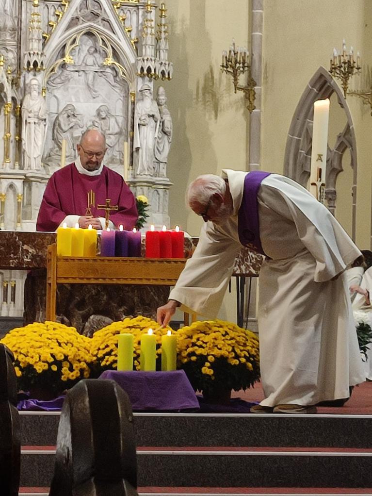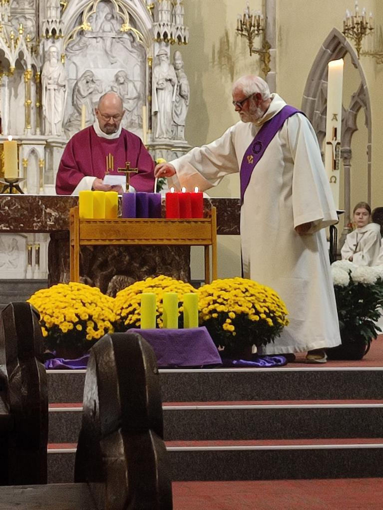 Après l'homélie de l'abbé Francis, 12 bougies ont été allumées, mois par mois en citant pour chaque mois, les défunts. 4 couleurs liturgiques pour chaque période de l'année. Dans l'après-midi, l'abbé avait proposé de chanter les vêpres en la chapelle du cimetière de la Montagne d'Albe.