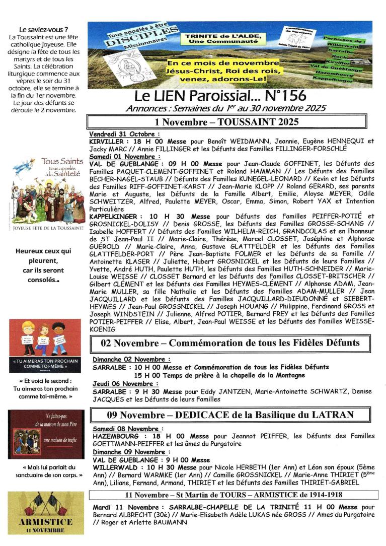 Mise à jour : 30 octobre 2025 Nouveau : Nouveau lien novembre 2025 Nouveau : Planning des Messes jusqu'au 31 décembre 2025