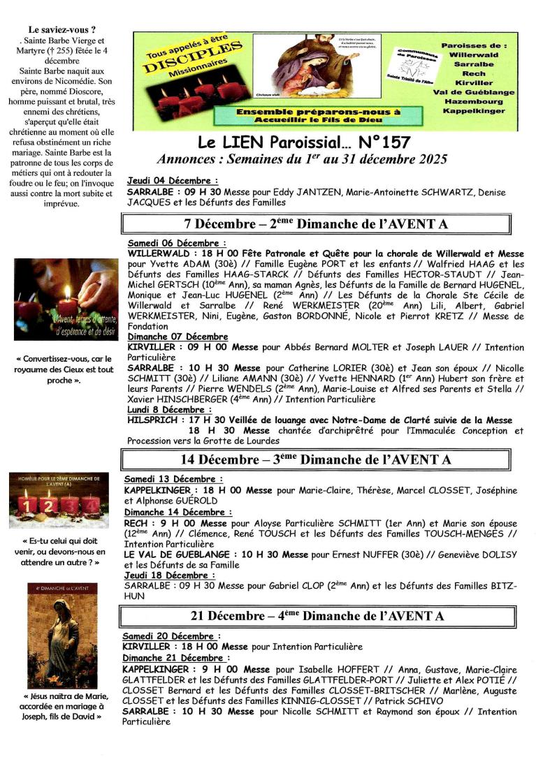 Mise à jour : 02 décembre 2025 Nouveau LIEN pour Décembre Planning des messes jusqu'à mai 2026