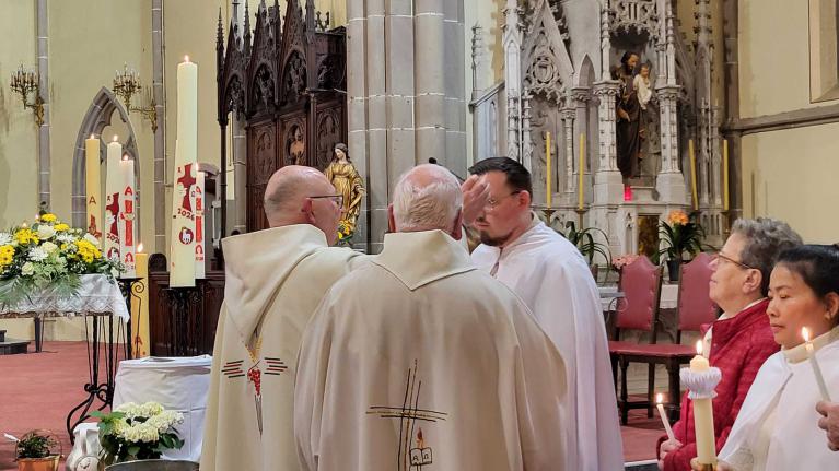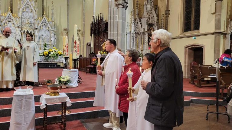 Ce dimanche a été le 3ème scrutin pour les néophytes. La Célébration a eu lieu à l'église de Kappelkinger. Pour les futurs baptisés, c'est un grand moment, pour les fidèles, une découverte et quelque chose qu'ils ont apprécié. Pour le troisième scrutin c'est à partir de l'évangile de la Résurrection de Lazare que tout est défini : "passer de la mort à la vie." Les Évangiles de ces 3 dimanches évoquent les grands symboles du baptême chrétien.